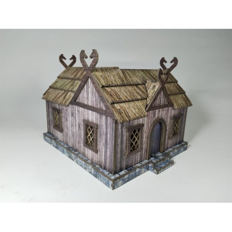 Esta no es la ostentosa sala de un rey, sino el robusto y respetable hogar de un guerrero. Su diseño refleja fuerza y experiencia, la morada de alguien cuya riqueza se mide en hazañas y en la calidad de su acero. Es el lugar perfecto para representar el cuartel de tu banda de guerra en SAGA o el hogar de una familia de combatientes en un diorama más grande.