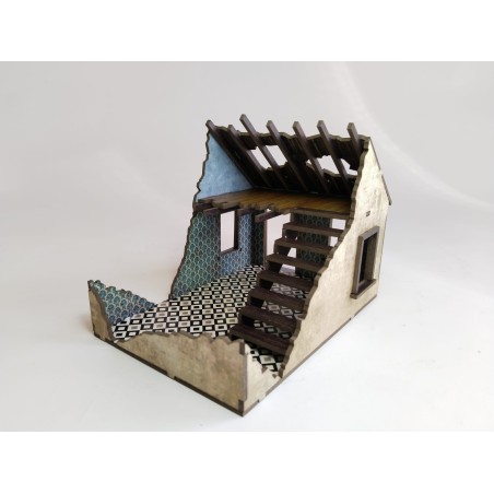 La escalera interior, aún en pie entre la destrucción, añade un elemento estratégico y narrativo, permitiendo el acceso a posiciones elevadas o sirviendo como cobertura en enfrentamientos dentro del edificio. Su estructura compacta lo hace ideal tanto para representar viviendas modestas como pequeños puestos de resistencia en zonas urbanas.